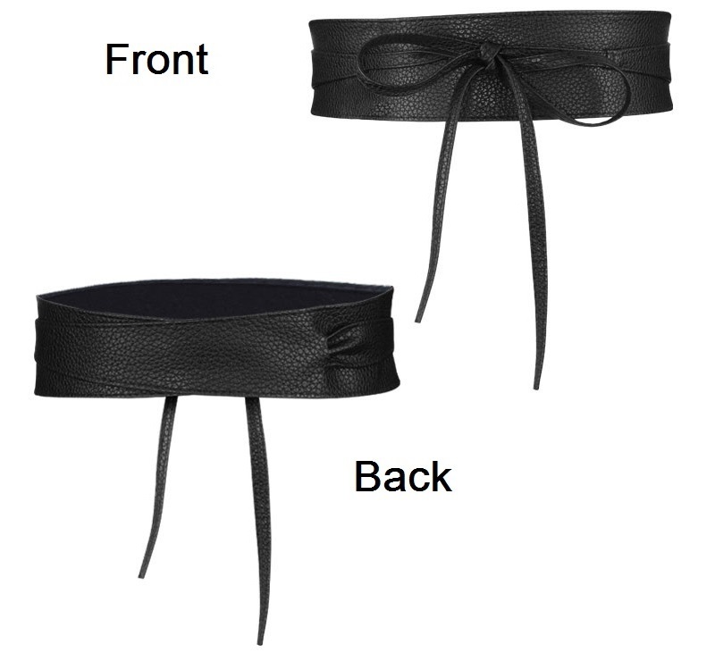 Ladies cummerbund style fashion belt with tie up front. As this belt wraps and ties, it is suitable for various waist sizes.