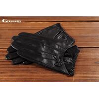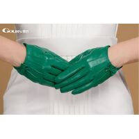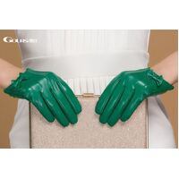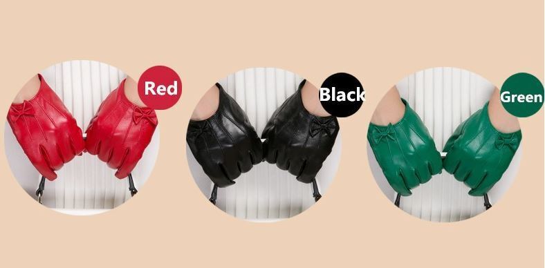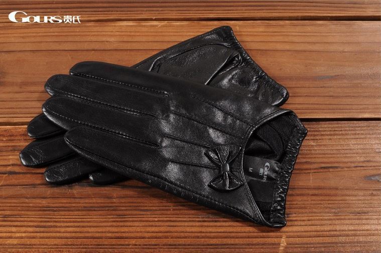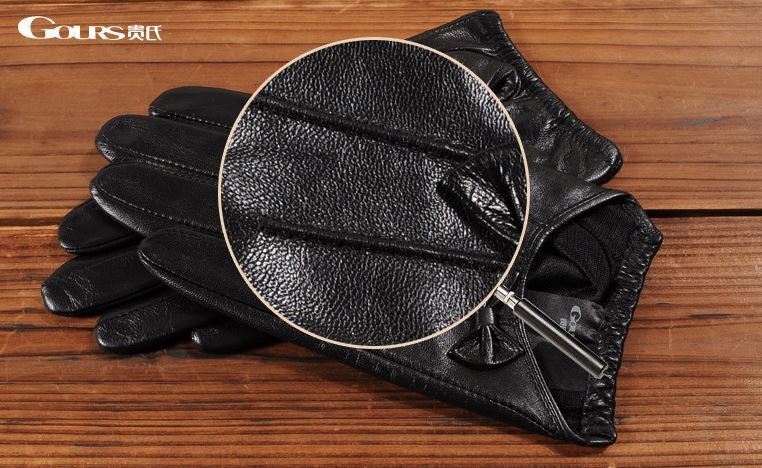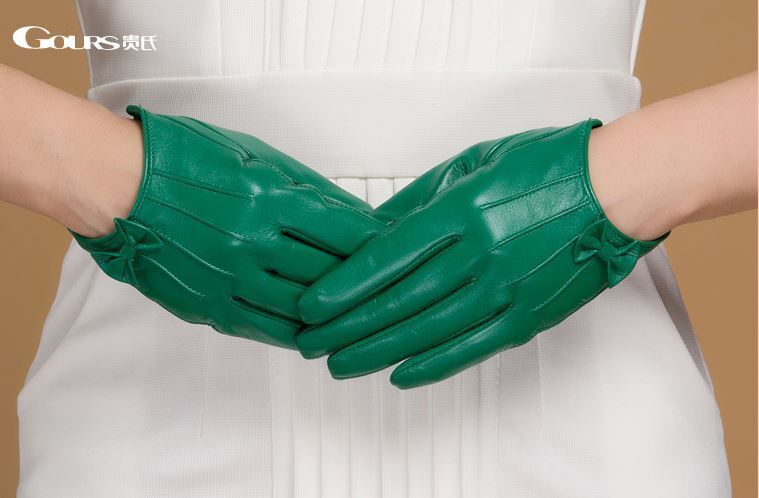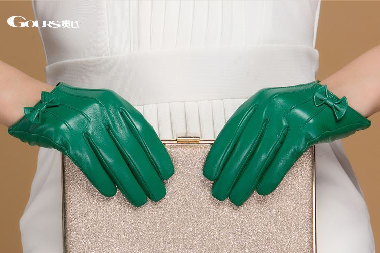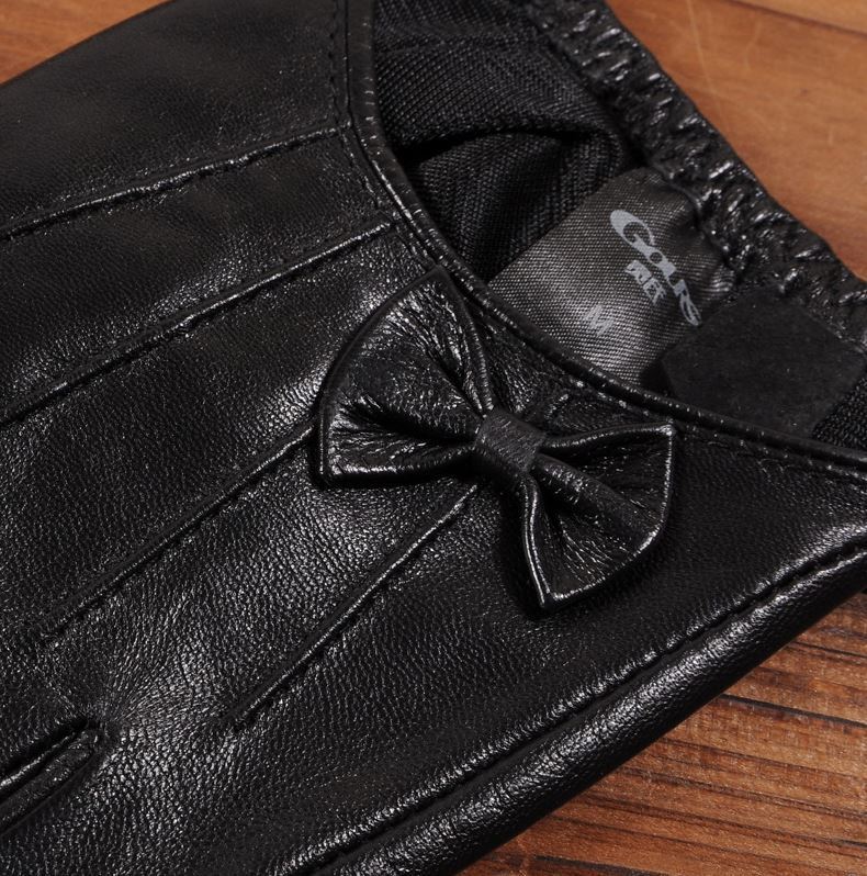 Beautiful soft 100% leather gloves featuring stiching detail and small bow. Gathered at inner wrist for a neat fit with a synthetic lining.